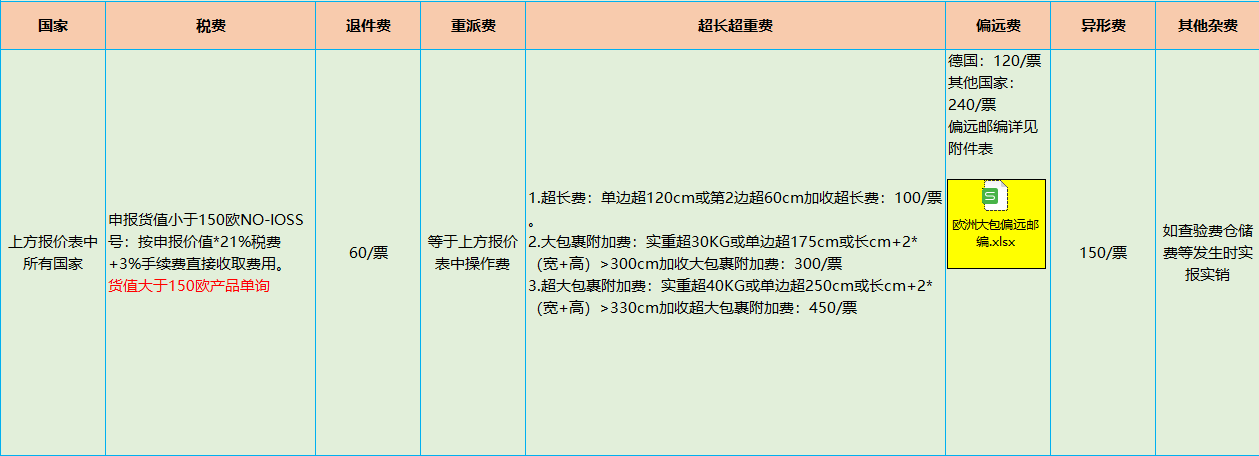 1) 拒接申报价值超过150欧/票的货物,如因客户虚报后续产生的相关查验和税费等费用实报实销,另加3%的手续费。